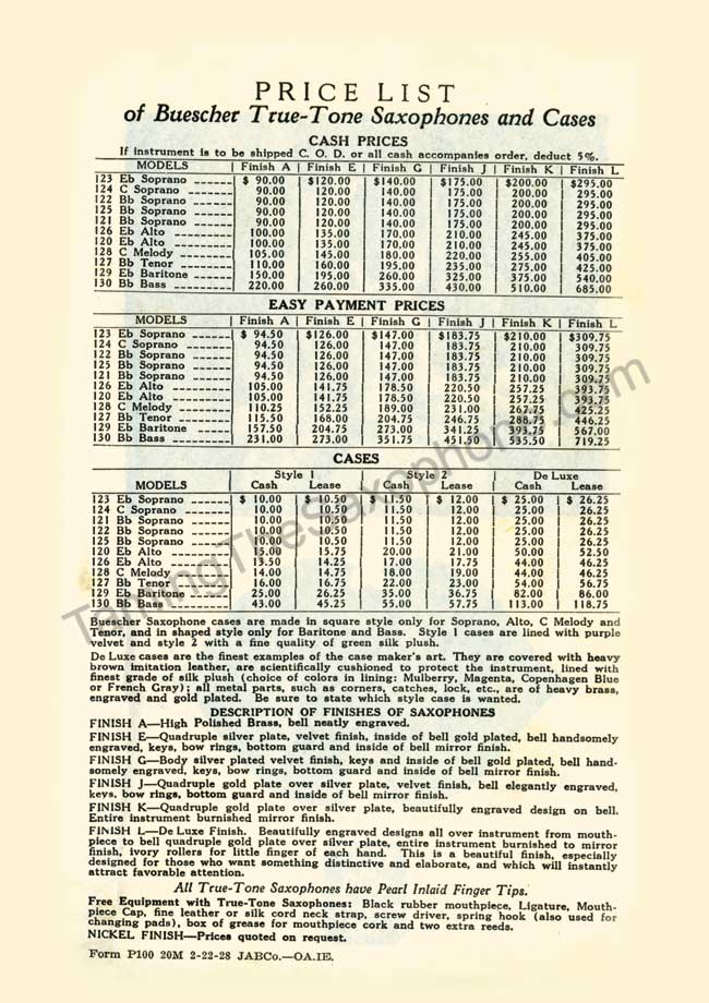 F.A.Buescher first took up the models of Sax in much the way that a man following any artistic calling will take up the work of old masters – reverently, and with little thought of possible improvement. But as he got into the work he discovered many scale inaccuracies that he could remedy; many tapers that he could alter to improve tone-quality.